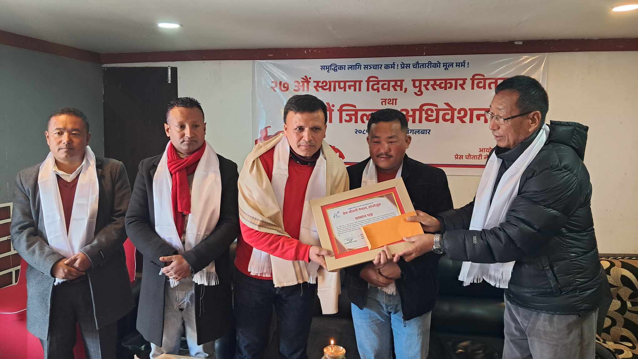 ताप्लेजुङ, २२ माघ । ताप्लेजुङ प्रेस चौतारी नेपालले २७ औं स्थापना दिवसको अवसरमा जिल्लाका तीन जना पत्रकार पुरस्कृत गरेको छ ।
